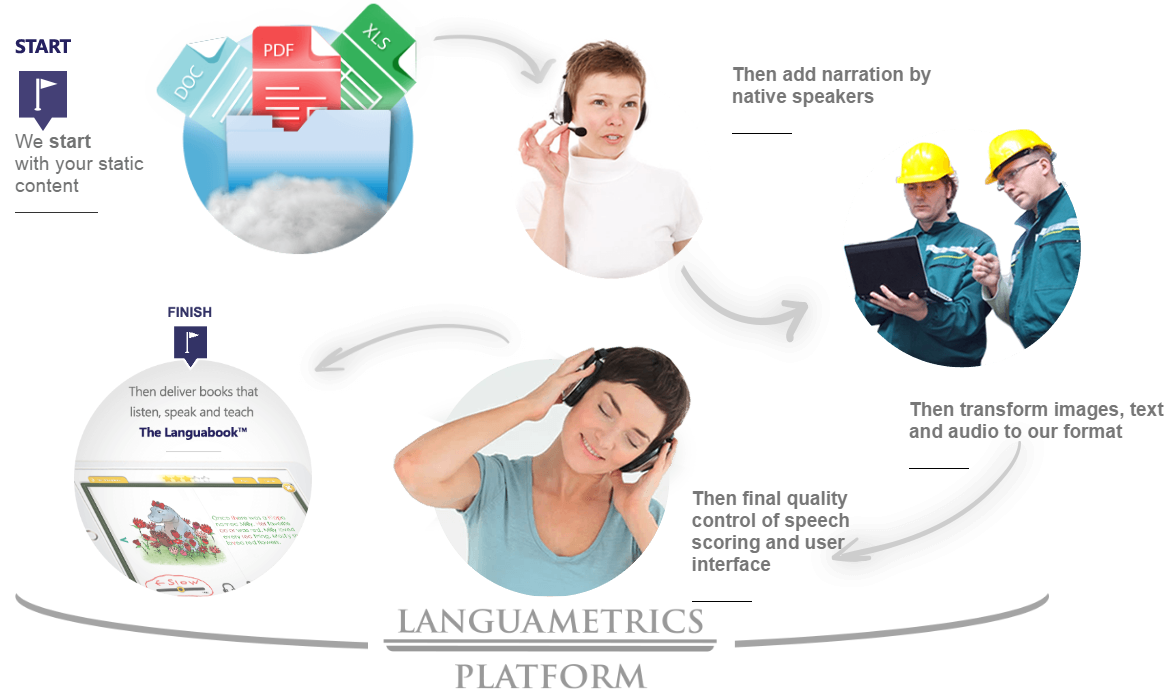 Experience the LanguaMagic – let us make your content come alive! We start with digital copies of your titles, PDF’s, Word docs, JPG’s. Then bring in native speakers to record all the model audio. We handle the page layouts and data transformations and before you know it a paper based book becomes a LanguaBook™ - the most advanced format of a book with the power to accelerate learning for English language learners and Struggling Readers.